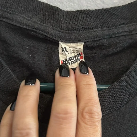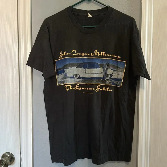 Vintage 1987 John Cougar Mellencamp This Screen Stars short sleeve tee features a striking vintage car graphic on a classic black background, perfect for those who appreciate retro Americana style. The soft fabric and timeless design make it a versatile addition to any casual wardrobe.P2P 21 inches Length 28 inchesSingle Stitch